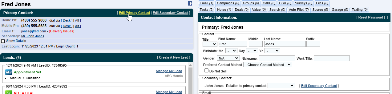 Primary Contact: Add or edit Name, phone numbers, email address, and other contact information of the primary contact.