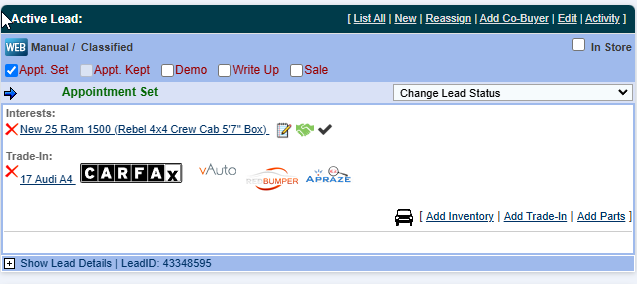 Add Inventory, Add Trade-In Buttons to add information about inventory, trade-ins associated with the lead.