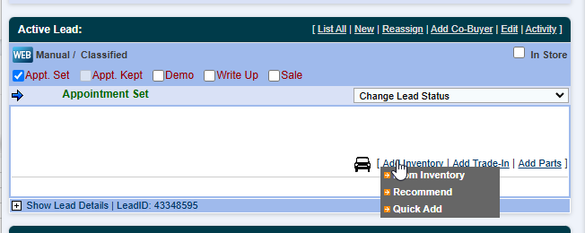 - Access Inventory: Click on the "Add Inventory" button within the lead profile. This will open a new window displaying your current vehicle inventory.