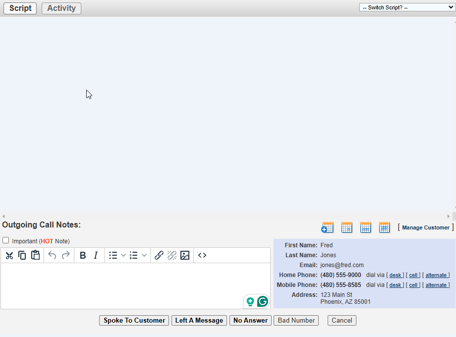 - Select Outcome: Choose the appropriate outcome from the provided options (e.g., "Spoke to Customer","Left Voicemail","No Answer").