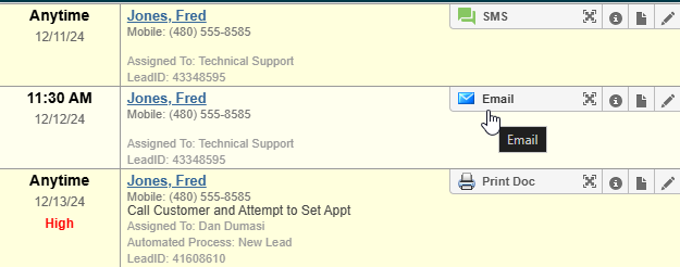The CRM supports different task types, including emails, SMS messages, print documents, and phone calls. Here's how to complete each: