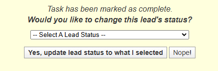 - Update Lead Status: If the lead is currently open, you'll be prompted to update its status based on the outcome of the task. This helps you keep your lead pipeline organized and reflects the progress of each lead.